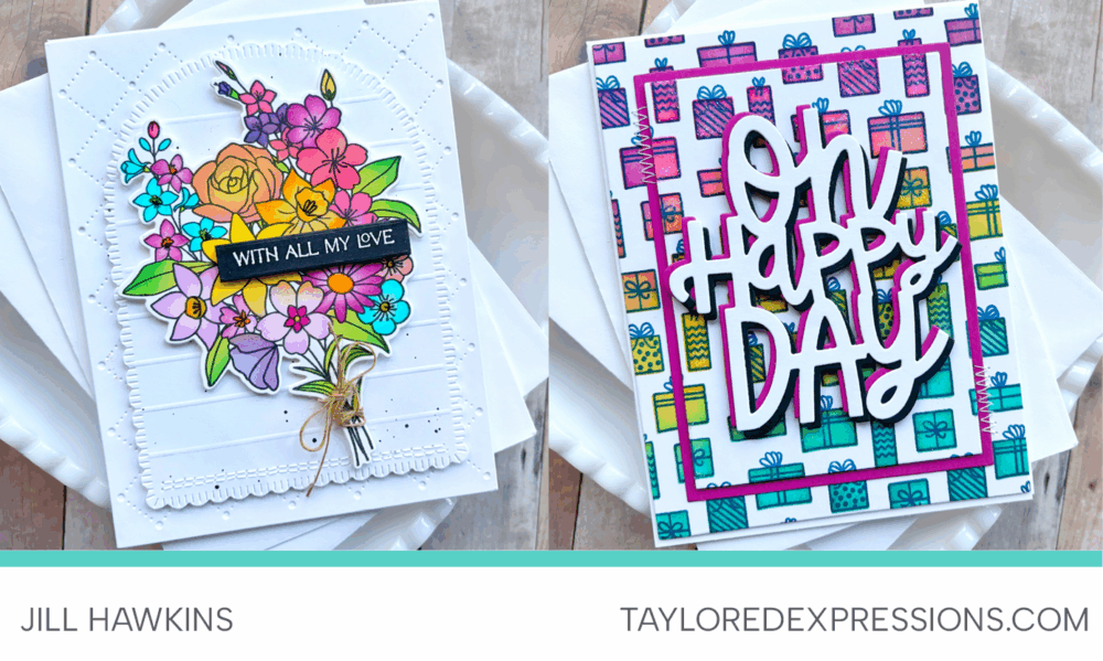 Jill Hawkins made two colorful projects using the Another Year in Bloom Bundle and the Present Parade $200 Gift with Purchase. She kept crisp white backgrounds and brought everything to life with a rainbow of colors that make each element pop right off the page.
