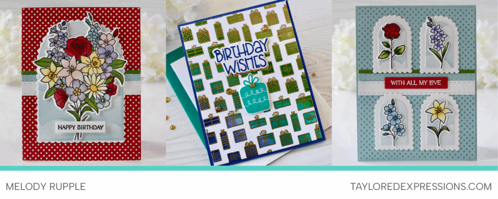 Melody Rupple created three beautiful projects, two with the Another Year in Bloom Bundle and one with the Present Parade $200 Gift with Purchase. For one floral card, she featured the full bouquet from the bundle, and for the other she used a layout that highlights the individual flowers.