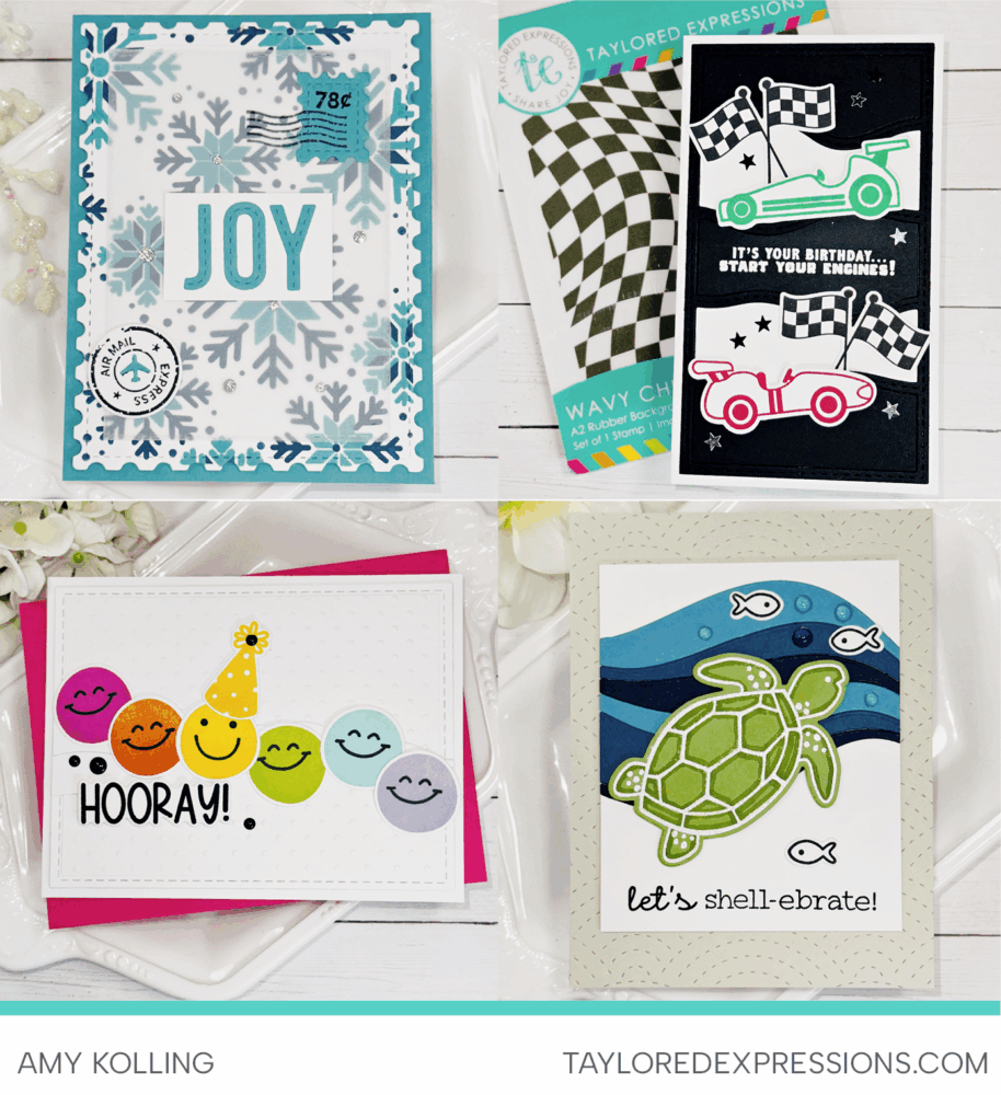 Amy Kolling shared a fun variety of Cute Combo projects! She paired Air Mail Stamp & Die Combo with soft snowflakes for a sweet winter look, went bold with a black background on her Fast Track card, and created a happy rainbow of smileys for Smiley Squad. She also brought the Turtle-y Awesome Stamp & Die Combo to life by combining it with the Rainbow Bright 3 Die Set in ocean shades of blue.