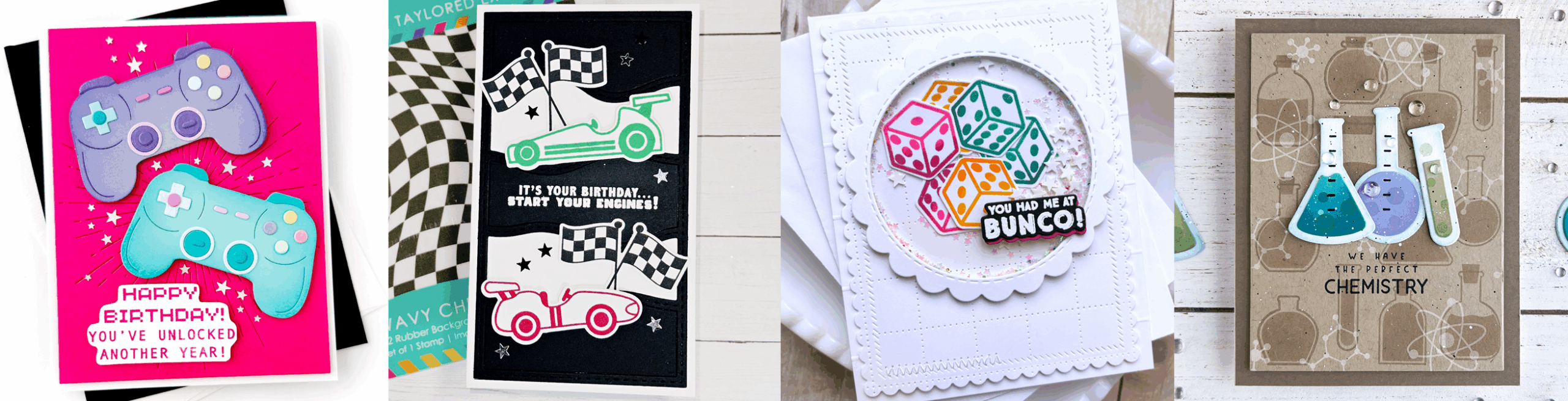 Hi Crafty Friend, Taylor here! I’m so excited to share our newest round of Cute Combos with you. These tiny but mighty stamp and die combos cover a wide variety of themes and interests, from card games and video games to race cars, chemistry, and more. Whether you are crafting for kids, teens, friends, or family, there is something in this collection that will fit their personality and make them smile.