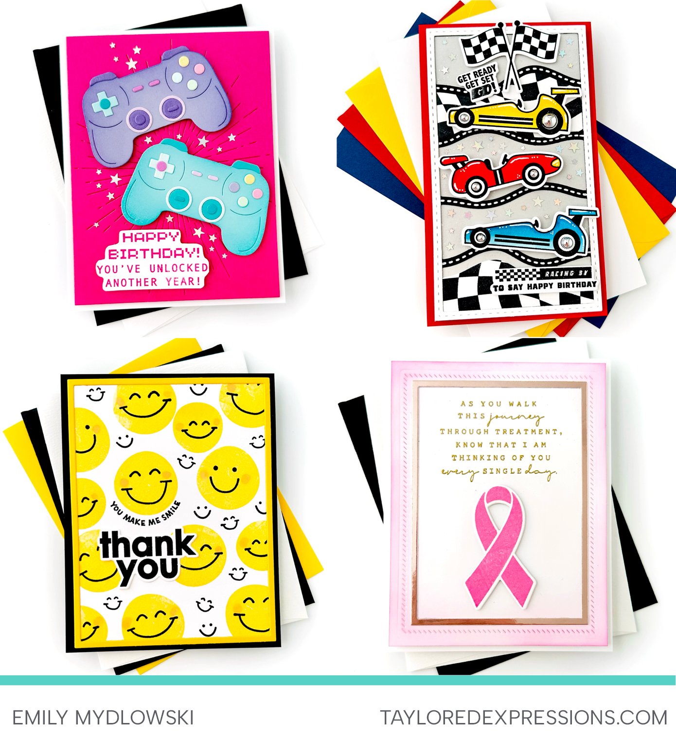 Emily Mydlowski shared a vibrant mix of Cute Combo projects! Her Level Up Stamp & Die Combo card shines with purple and teal controllers on a bright pink background, while her Fast Track card pops with classic primary colors. She brought sunny cheer to Smiley Squad using bright yellows with black and white accents, and her Hope & Healing card pairs soft pastels with a bold pink ribbon that takes center stage.
