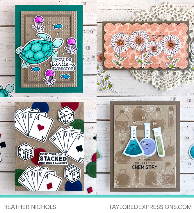 Heather Nichols brought Toffee to the table! Each of her Cute Combos projects features a Toffee card base or panel, and she added thoughtful background details to match the theme of every card. For her Turtle-y Awesome card, she used the Embossing Folder – Halftone Dots to create bubbly texture. The Delicate Daisy card has several background details including Fineline Script Background Stamp and Midnight Blooms Background Stamp. Her Game Night card pairs perfectly with the Knock On Wood Background Stamp to mimic a classic game table. And for Let’s Bond, she added a tone-on-tone background with the If You Dare Stamp & Stencil Combo to match the beakers.