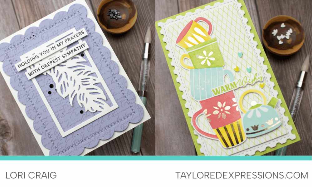 Lori Craig created two very different designs! She used the Peace With In Die Set to create a thoughtful card that works beautifully for sympathy. She paired the Triple Slim – In the Kitchen stencil with the Stacked Cups Die for a bright, kitchen-inspired design filled with visual interest.