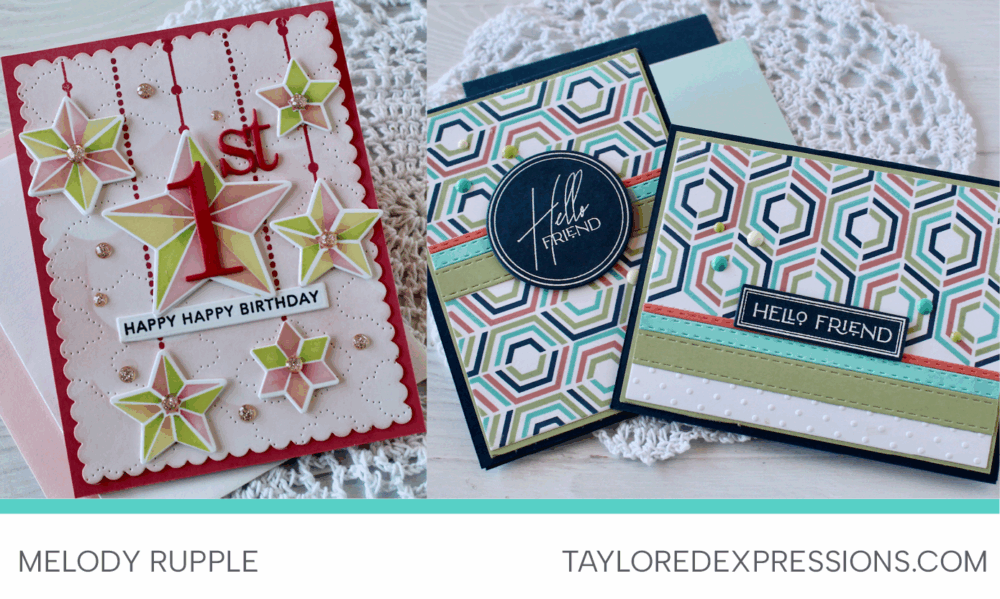 Melody Rupple showed how fun and flexible these products can be! She used the Create-in-Quads – Deck the Halls Stars and coordinating Cutting Plate to make a sweet first birthday card, with an easy number swap that makes the design simple to personalize for any age. She also used Create-in-Quads – Hexagons to create a funky, modern card with lots of graphic interest.