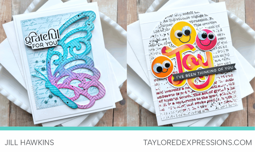 Jill Hawkins created two joyful cards! She used Filigree in Flight to create a beautiful card. She used Play on Words – Holiday and gave it a fresh twist by using the word “joy” in a warm color combo. Paired with the smiley faces from the Smiley Squad Stamp & Die Combo, it becomes a cheerful, non-holiday thinking-of-you card!