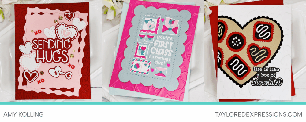 Amy Kolling created three beautiful cards, one from each of the new Valentine collections. Her first leans into classic reds and pinks, the second pairs bright pink with a soft, muted blue, and the third features chocolatey browns and warm reds layered over an embossed white background.