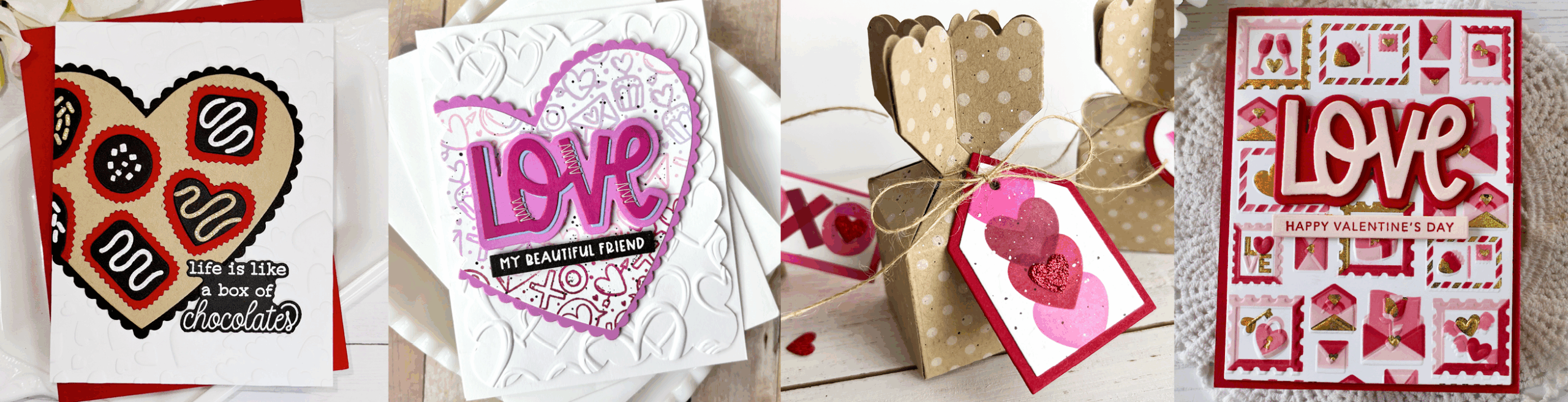 Melody Rupple created a fun mix of projects using the new Valentine’s Day goodies. She leaned into classic reds and pinks, then added playful pops of color throughout. On her chocolates card, a touch of minty green gives the design a fresh twist, while her tags and postmarked projects are accented with sparkly gold.