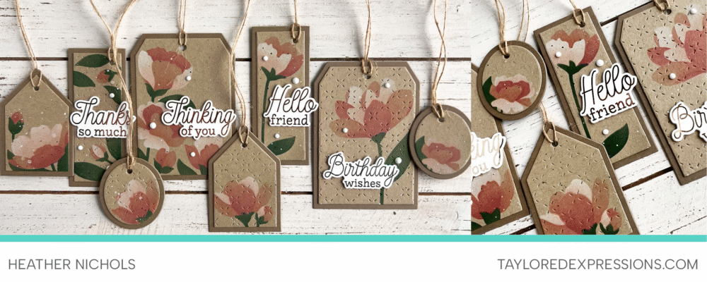 Heather Nichols created a lovely set of Toffee tags using the Design Duo Layering Stencil – Simple Tags Timeless Blooms. Scroll down to watch her video tutorial and see exactly how she brings these tags together, with tips you can easily use in your own crafting!
