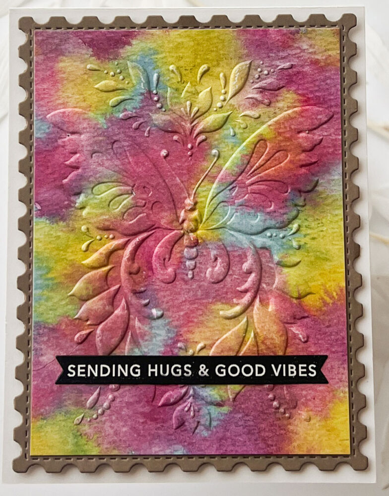 This card features white embossed butterfly design over vibrant watercolor backgrounds, which is a classic resist technique.