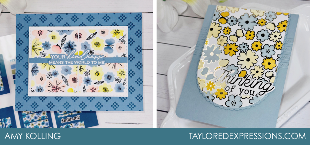 TE Creative Team member Amy Kolling is sharing a fresh take on the Florals & Flutters Cardmaking Kit with these soft, serene designs. Using the included stamp and stencil combo along with the Happy Square Sheets, Amy creates beautifully balanced panels that let the delicate florals shine.