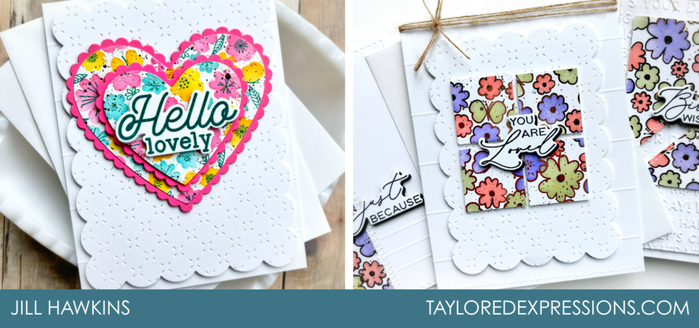 TE Creative Team member Jill Hawkins shares a beautiful mix of soft texture and bold focal elements with her Florals & Flutters creations. Her layered heart design highlights how striking the kit’s florals can be, while her clean, framed layout lets the details shine.