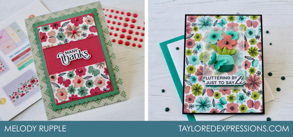 TE Creative Team member Melody Rupple brings a bright, cheerful touch to the Florals & Flutters Cardmaking Kit with these playful designs. Her use of bold color and layered elements adds dimension while letting the florals shine.