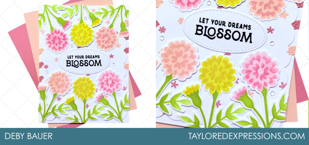 TE Creative Team Member Deby Bauer fills her card with a cheerful array of florals, combining soft pinks, yellows, and greens for a bright, layered design that perfectly frames her uplifting sentiment.