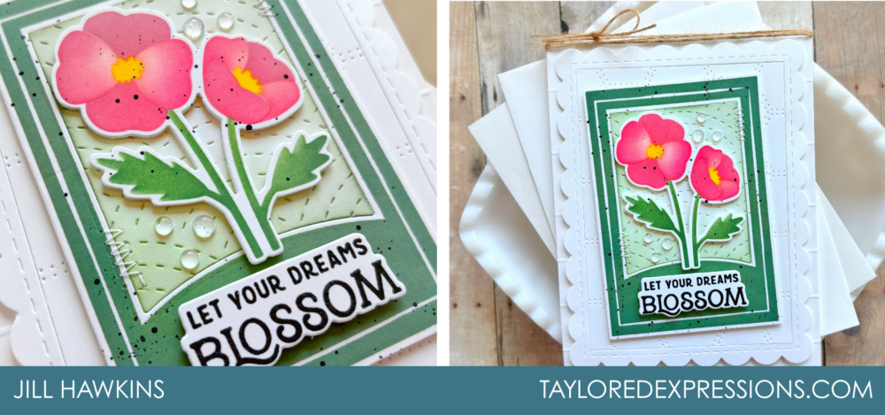 TE Creative Team member Jill Hawkins adds depth and interest with layered frames, stitching details, and soft ink blending, bringing her bright florals to life with dimension and delicate finishing touches.