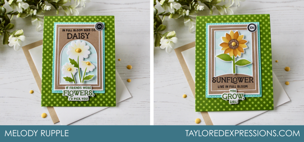 TE Creative Team member Melody Rupple pairs bold patterned backgrounds with crisp seed packet designs, adding pops of color and playful contrast for cards that feel bright, happy, and full of personality.