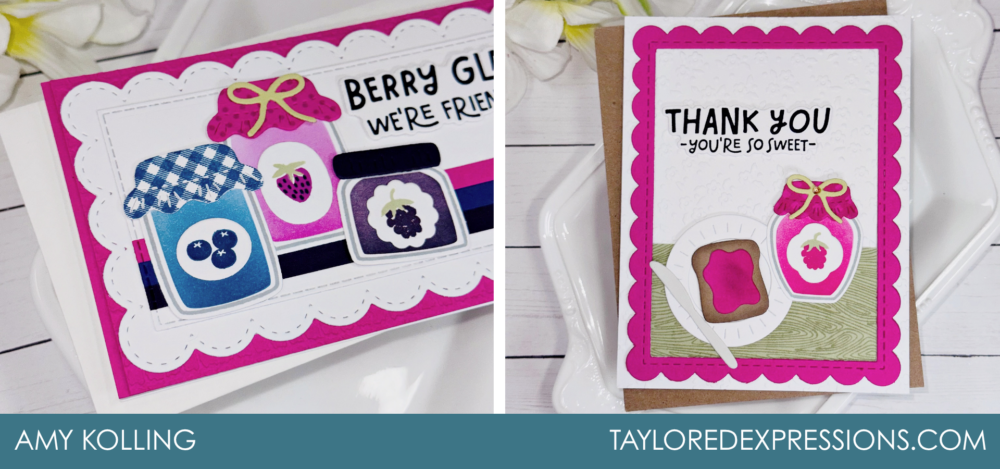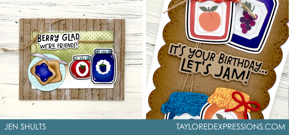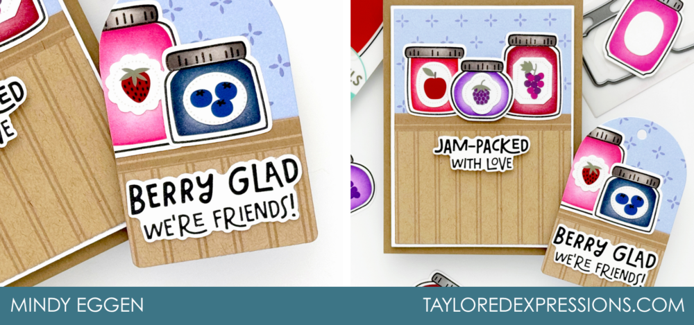 Creative Team member Mindy Eggen keeps things clean and classic with soft color blending and simple, well-balanced layouts. Her use of subtle background patterns and layered die cuts allows the jam jars and sentiments to shine, creating cards that feel polished, approachable, and effortlessly put together.